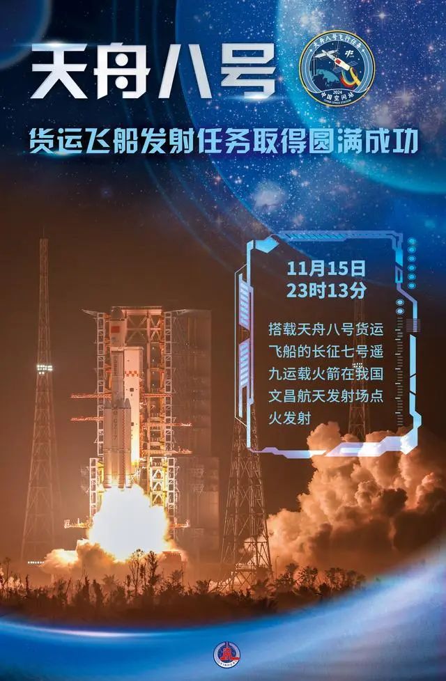 搭載天舟八號(hào)貨運(yùn)飛船的長征七號(hào)遙九運(yùn)載火箭,于北京時(shí)間11月15日23時(shí)13分在我國文昌航天發(fā)射場點(diǎn)火發(fā)射。