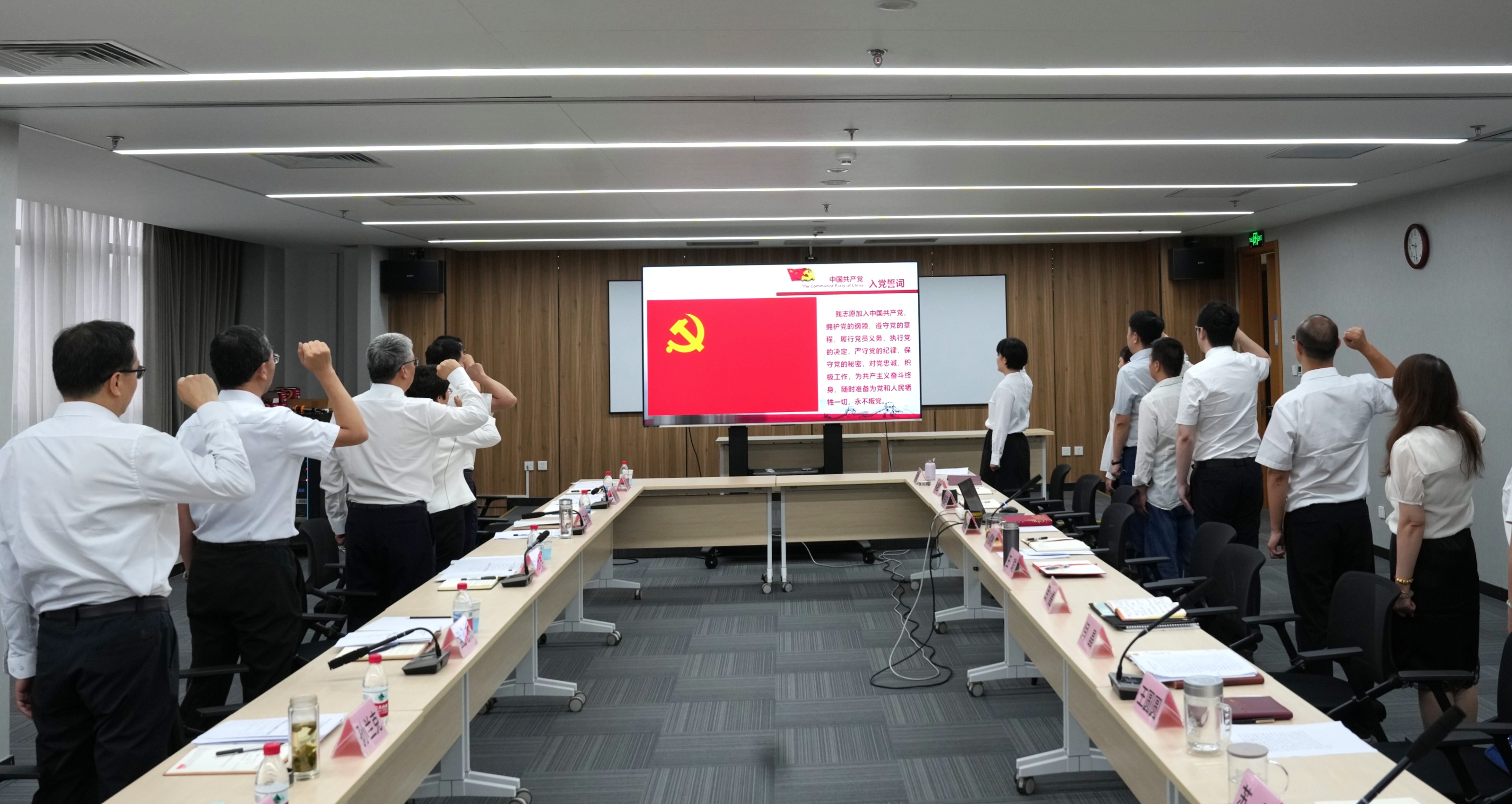 交流發(fā)言結(jié)束后,全體黨員在莊嚴(yán)的黨旗下重溫入黨誓詞。