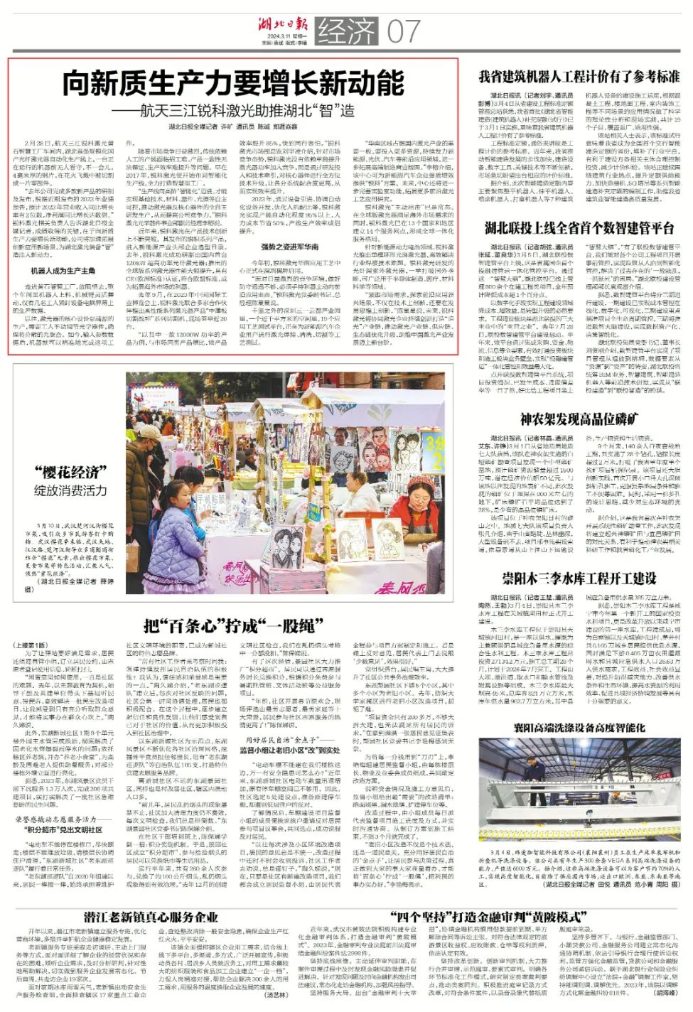 近年來,中國航天科工航天三江為我國高端裝備制造業(yè)不斷輸出先進生產(chǎn)力,以“新”賦能“智”造,大力推動我國工業(yè)制造向“新”而行。3月11日,《湖北日報》對航天三江亮點領(lǐng)域——激光產(chǎn)業(yè),進行了重點報道。