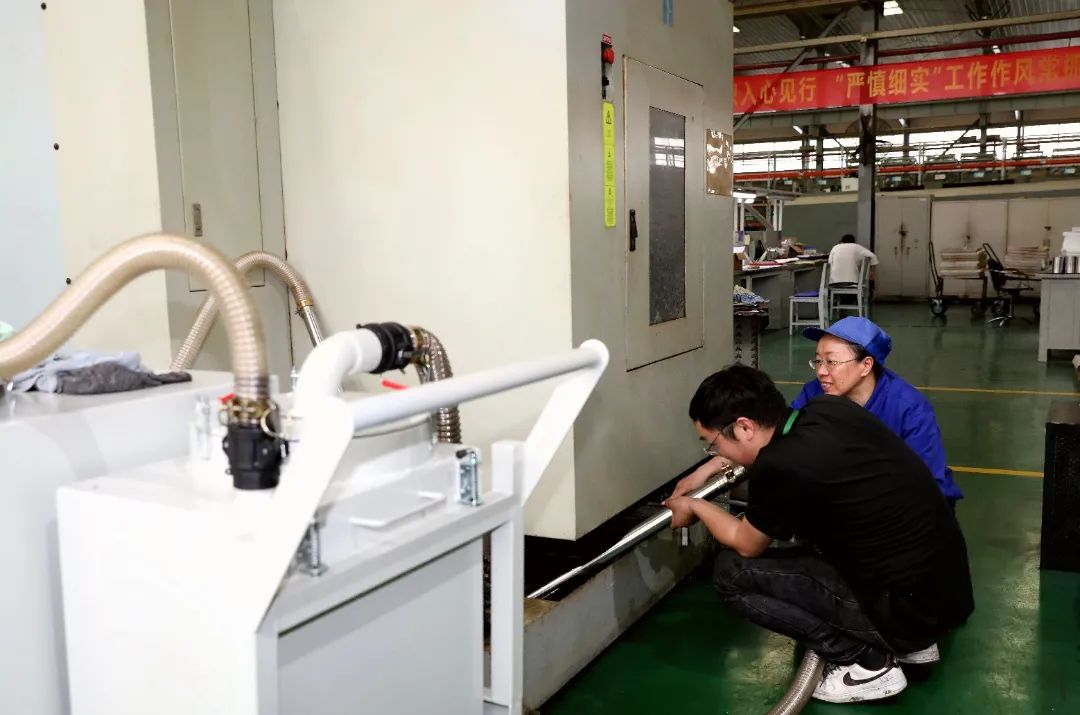 在大廳的另一側(cè),車工小楊正認(rèn)真地跟設(shè)備廠家人員學(xué)習(xí)清洗機(jī)床切削液。數(shù)控機(jī)床作為生產(chǎn)的關(guān)鍵設(shè)備,其運(yùn)行狀態(tài)直接影響生產(chǎn)節(jié)奏。為確保其“健康”,該公司不惜投入重金,購置清洗機(jī)和凈化機(jī),有效解決了設(shè)備維護(hù)保養(yǎng)耗時(shí)耗力、清理不徹底的難題。