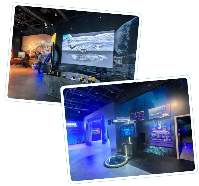 除了嫦娥六號(hào)采集的月壤等一系列國(guó)寶級(jí)展品的展出以外,本次展覽還有一大亮點(diǎn):項(xiàng)目團(tuán)隊(duì)充分發(fā)揮多媒體集成與軟件開發(fā)優(yōu)勢(shì),創(chuàng)造性地打造了“三航”CAVE沉浸式空間、虛擬現(xiàn)實(shí)的“月球基地”、“我的火星生活”“我的祝融號(hào)”“我的太陽(yáng)系”、空間站體驗(yàn)、“海天對(duì)話”等多個(gè)自主研發(fā)的展項(xiàng)。其中,迭代升級(jí)后的“海天對(duì)話”在語(yǔ)音識(shí)別能力上有了大幅提升,視頻、音頻、文字等多種內(nèi)容載體的結(jié)合也使得展項(xiàng)交互變得更加豐富。