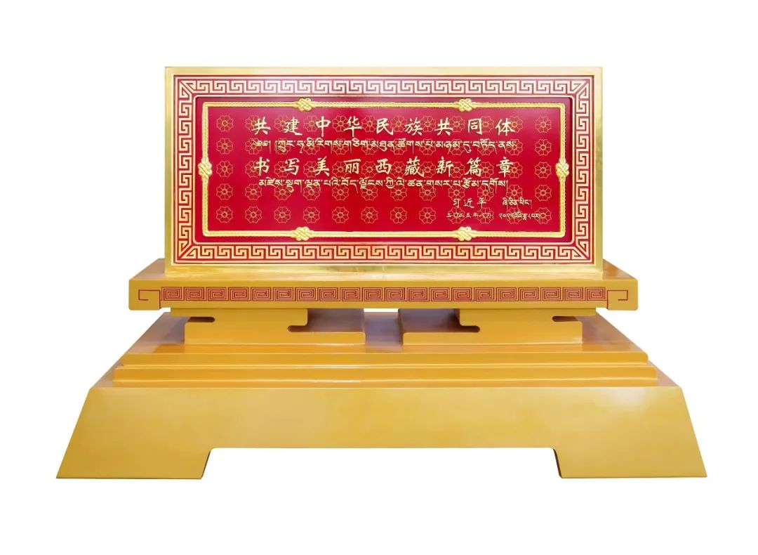 賀匾正面為習(xí)近平總書記題詞,背面展現(xiàn)西藏自治區(qū)成立60周年經(jīng)濟(jì)社會(huì)發(fā)展成就。整體造型端莊大氣,以鮮艷的中國(guó)紅為底色,采用格桑花紋、長(zhǎng)城紋、繩結(jié)紋等獨(dú)具匠心的特色設(shè)計(jì),象征民族團(tuán)結(jié)、共同繁榮,寓意各民族共同熔鑄為中華民族共同體。