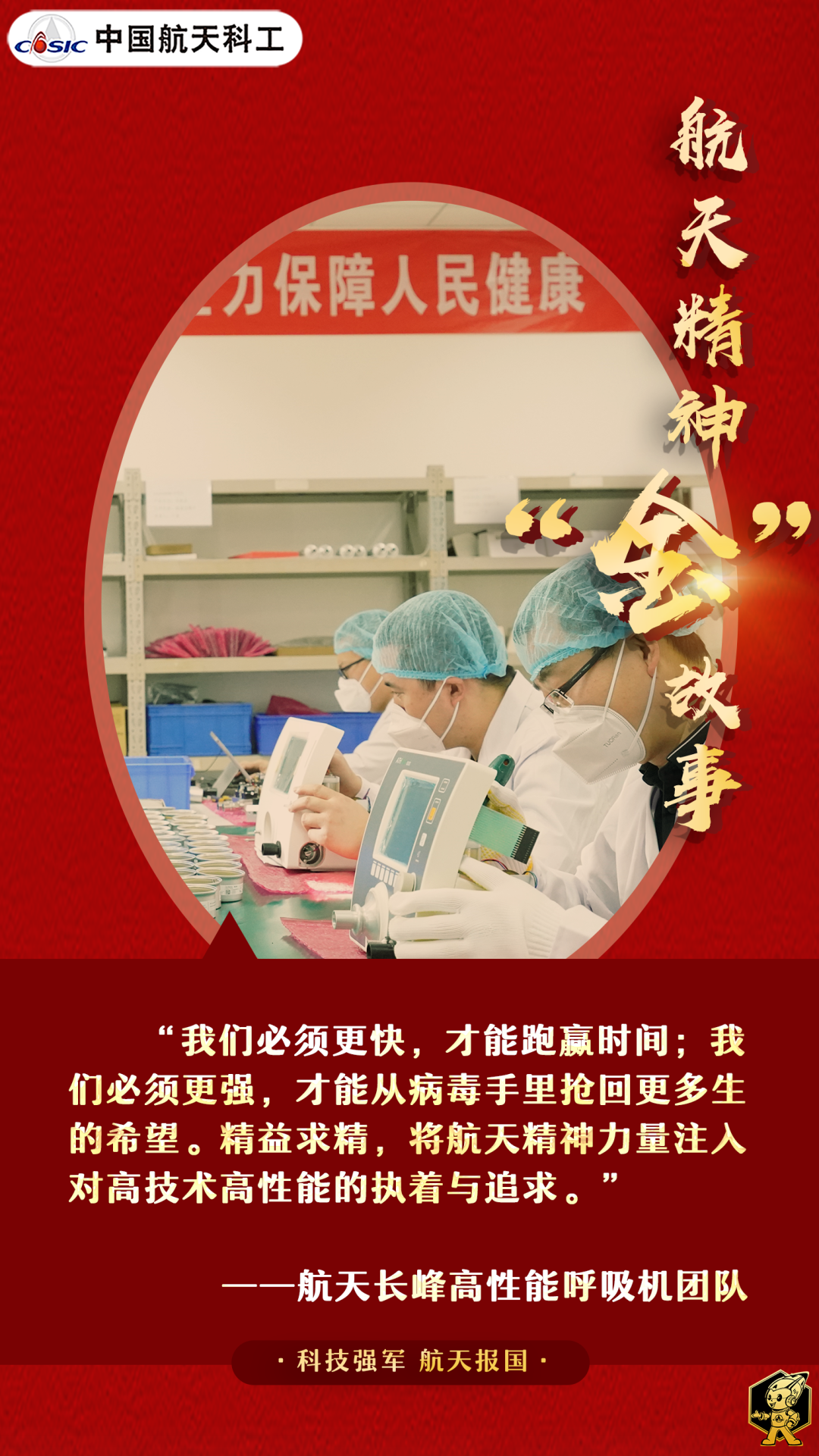 如今,航天長峰相繼攻克了核心零部件、電路系統(tǒng)、軟件控制系統(tǒng)等全鏈條技術(shù)難關(guān),成功研制出了國際領(lǐng)先水平的高性能超高速高揚(yáng)程微渦輪風(fēng)機(jī),全面自主掌握了呼吸機(jī)核心技術(shù),為護(hù)佑人民健康貢獻(xiàn)了航天智慧。(海報(bào)/張藝馨 文/張章)