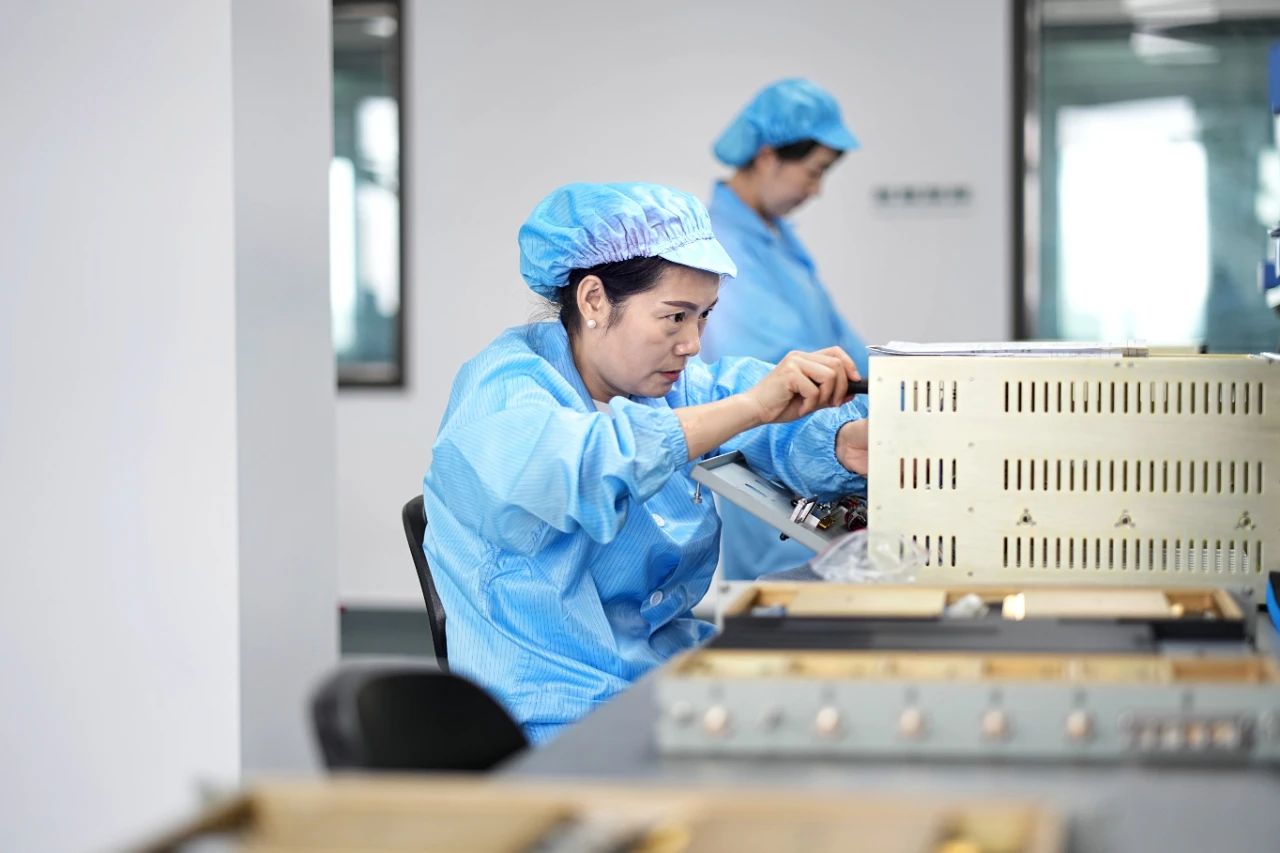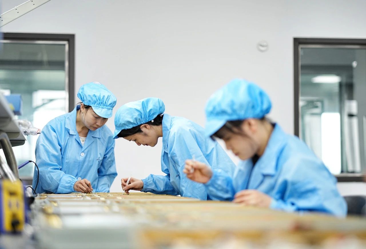近年來,電裝組邁步向現(xiàn)代化生產(chǎn)模式轉(zhuǎn)型,在工藝、技能上不斷創(chuàng)新,幫助公司多個重要型號實現(xiàn)核心組件功能。在金屬背板上,0.2毫米的棱形角比芝麻還小,她們卻以線槍為“針”,將直徑0.4毫米的絞線精準纏繞;在被稱為“微雕”的加工工序上,她們將不足發(fā)絲一半粗的導線,焊接在寬度一致的印制板線路上,不僅能精準把握細如流絲的用錫量,還能完美復刻印制板的金屬紋路圖案。