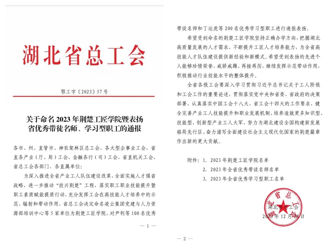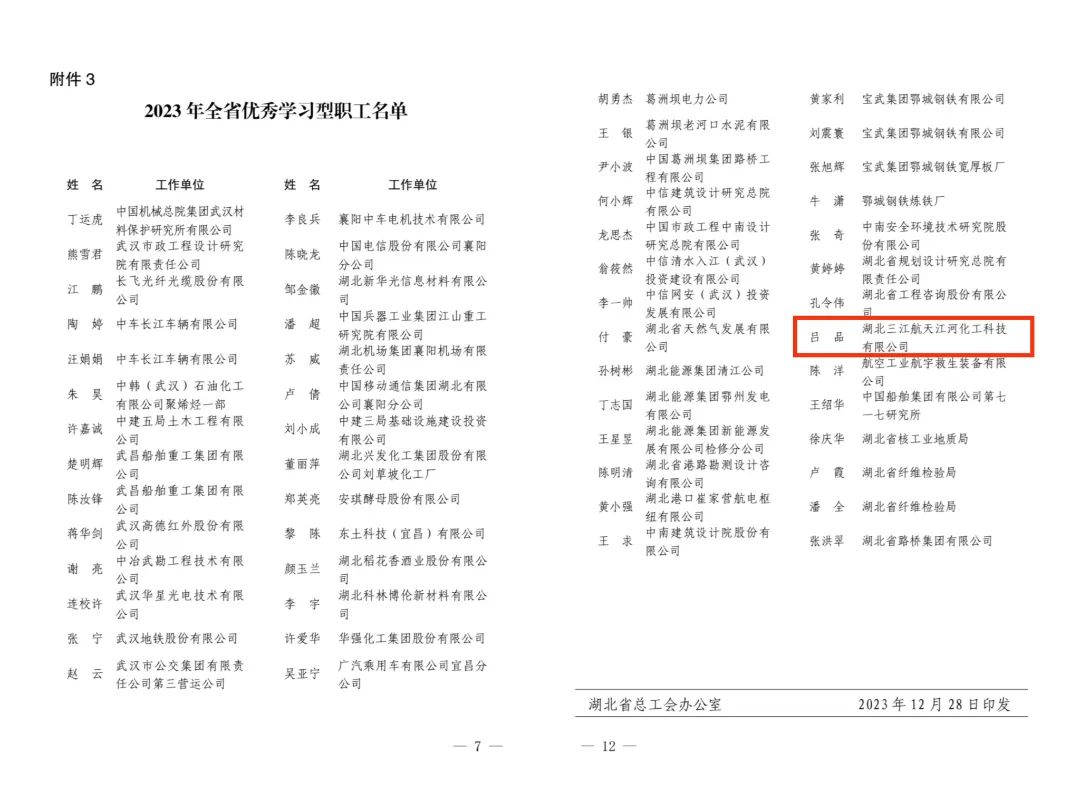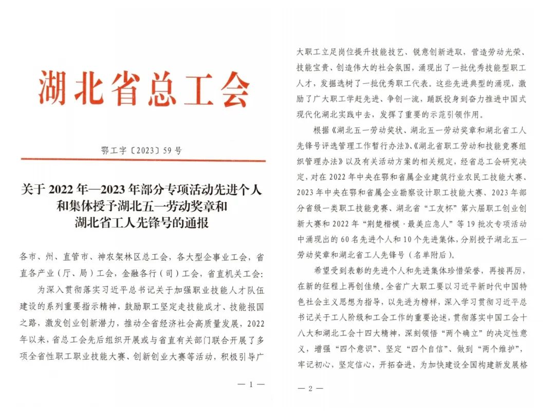 同時,從湖北省總工會《關于命名2023年荊楚工匠學院暨表揚省級優(yōu)秀帶徒名師、學習型職工的通報》(鄂工字[2023]57號文)獲悉,公司職工呂品喜獲2023年湖北省“優(yōu)秀學習型職工”榮譽稱號。