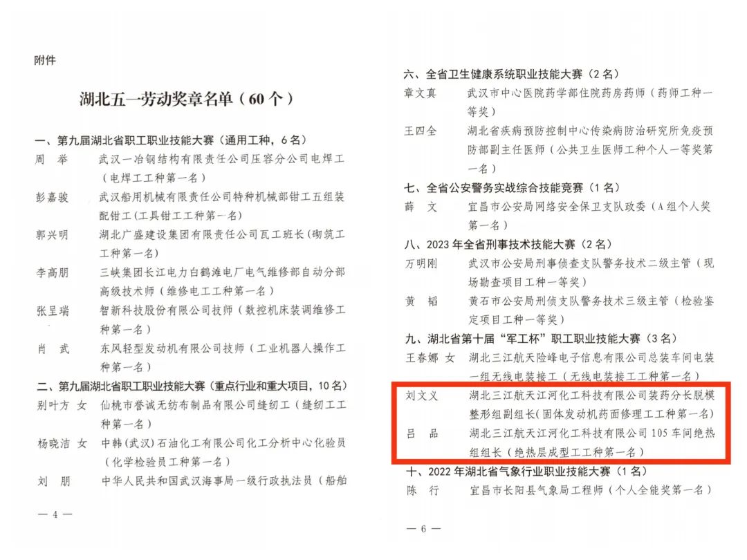 近日,從湖北省總工會《關于2022年-2023年部分專項活動先進個人和集體授予湖北五一勞動獎章和湖北省工人先鋒號的通報》(鄂工字[2023]59號文)獲悉,中國航天科工六院江河公司職工呂品和劉文義因在湖北省第十屆“軍工杯”職工職業(yè)技能大賽中獲第一名,被授予“湖北五一勞動獎章”殊榮。
