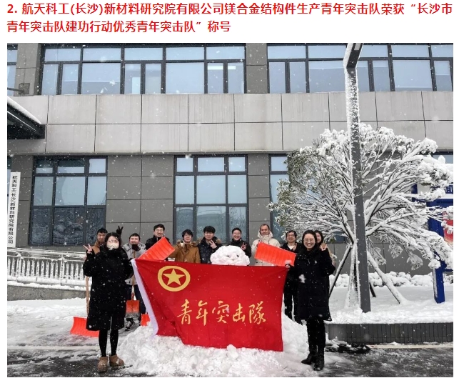 湖南航天天麓新材料檢測有限責(zé)任公司數(shù)字合格證運(yùn)營班組獲評(píng)“2023年度長沙市青年文明號(hào)”稱號(hào);航天科工(長沙)新材料研究院有限公司鎂合金結(jié)構(gòu)件生產(chǎn)青年突擊隊(duì)獲評(píng)“長沙市青年突擊隊(duì)建功行動(dòng)優(yōu)秀青年突擊隊(duì)”稱號(hào);航發(fā)公司周紅獲評(píng)“2023 年度長沙市青年崗位能手”稱號(hào)。