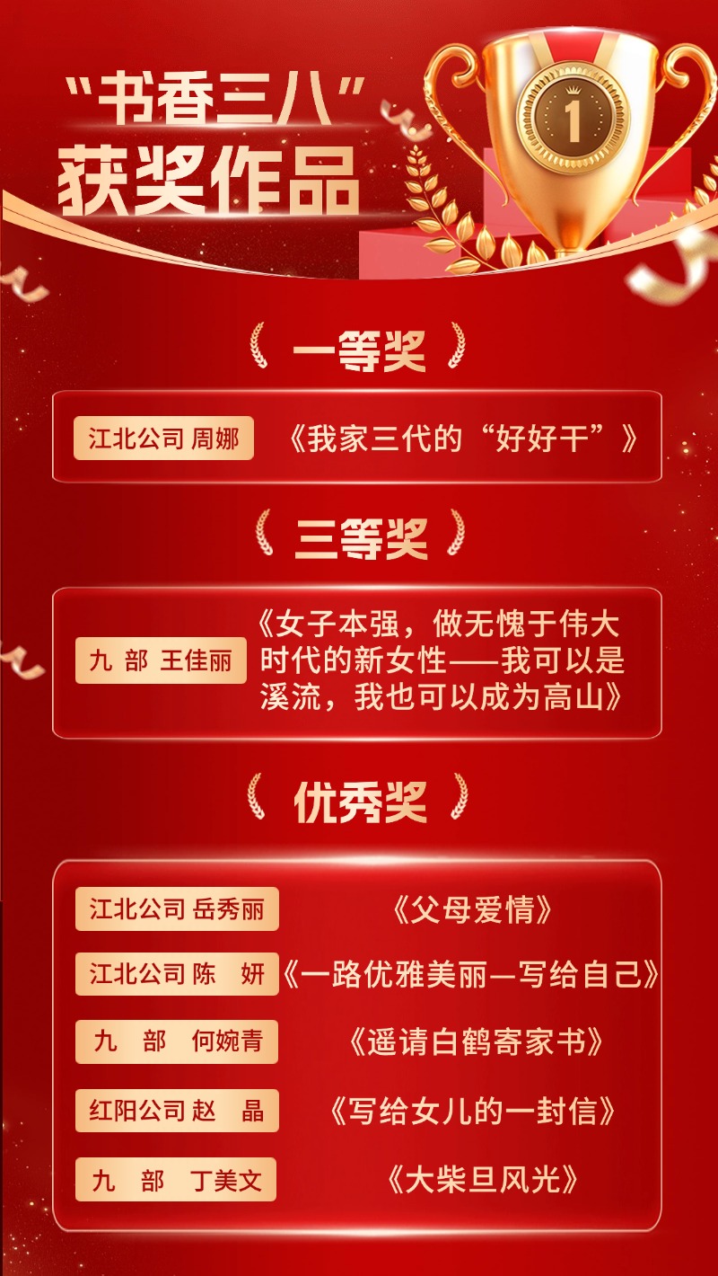 近日,全國(guó)第十二屆“書香三八”讀書活動(dòng)獲獎(jiǎng)名單揭曉,航天科工九院工會(huì)委員會(huì)獲得“優(yōu)秀組織獎(jiǎng)”,個(gè)人獲獎(jiǎng)作品7篇,其中一等獎(jiǎng)1篇、三等獎(jiǎng)1篇、優(yōu)秀獎(jiǎng)5篇。
