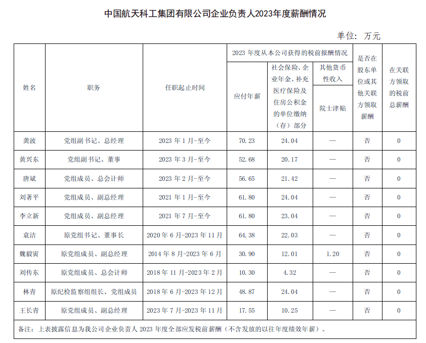 中國(guó)航天科工集團(tuán)有限公司企業(yè)負(fù)責(zé)人2023年度薪酬情況