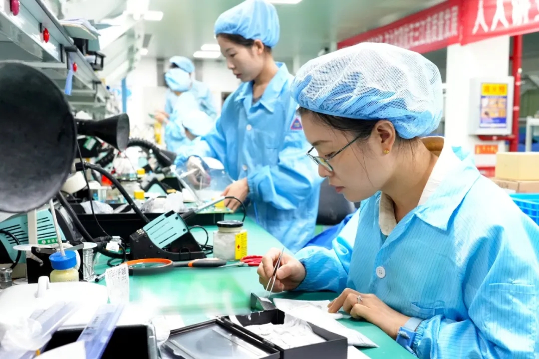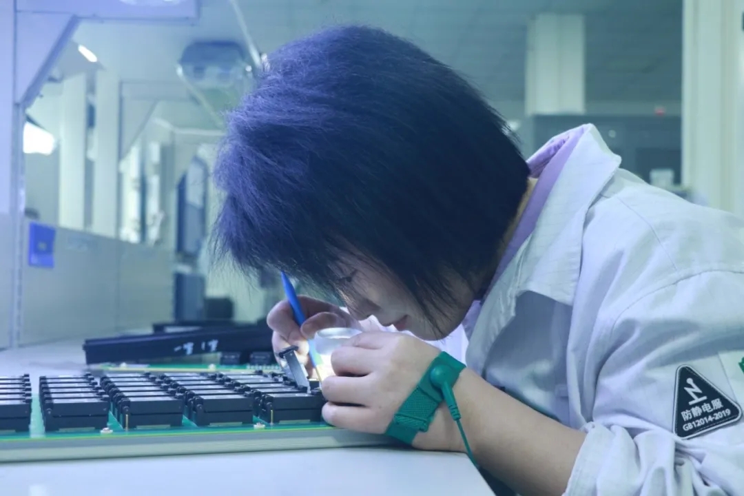 走進(jìn)班組工作區(qū),師傅們眼神專注而堅定,目光緊盯電路板,手臂平穩(wěn)移動,烙鐵在指尖靈活運(yùn)轉(zhuǎn)。在她們手中,烙鐵仿佛畫筆,在電路板上勾勒出一個個完美的焊點。